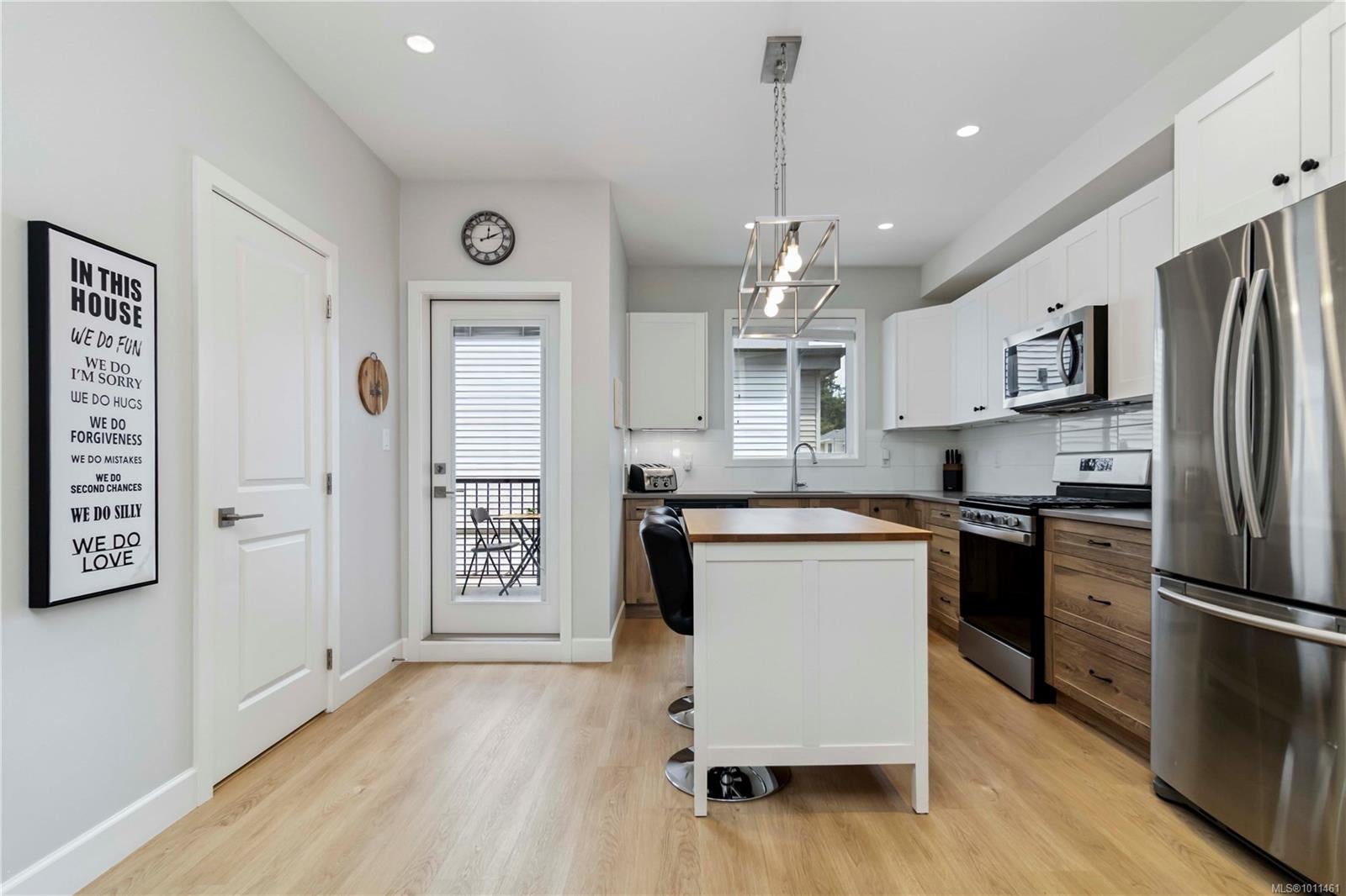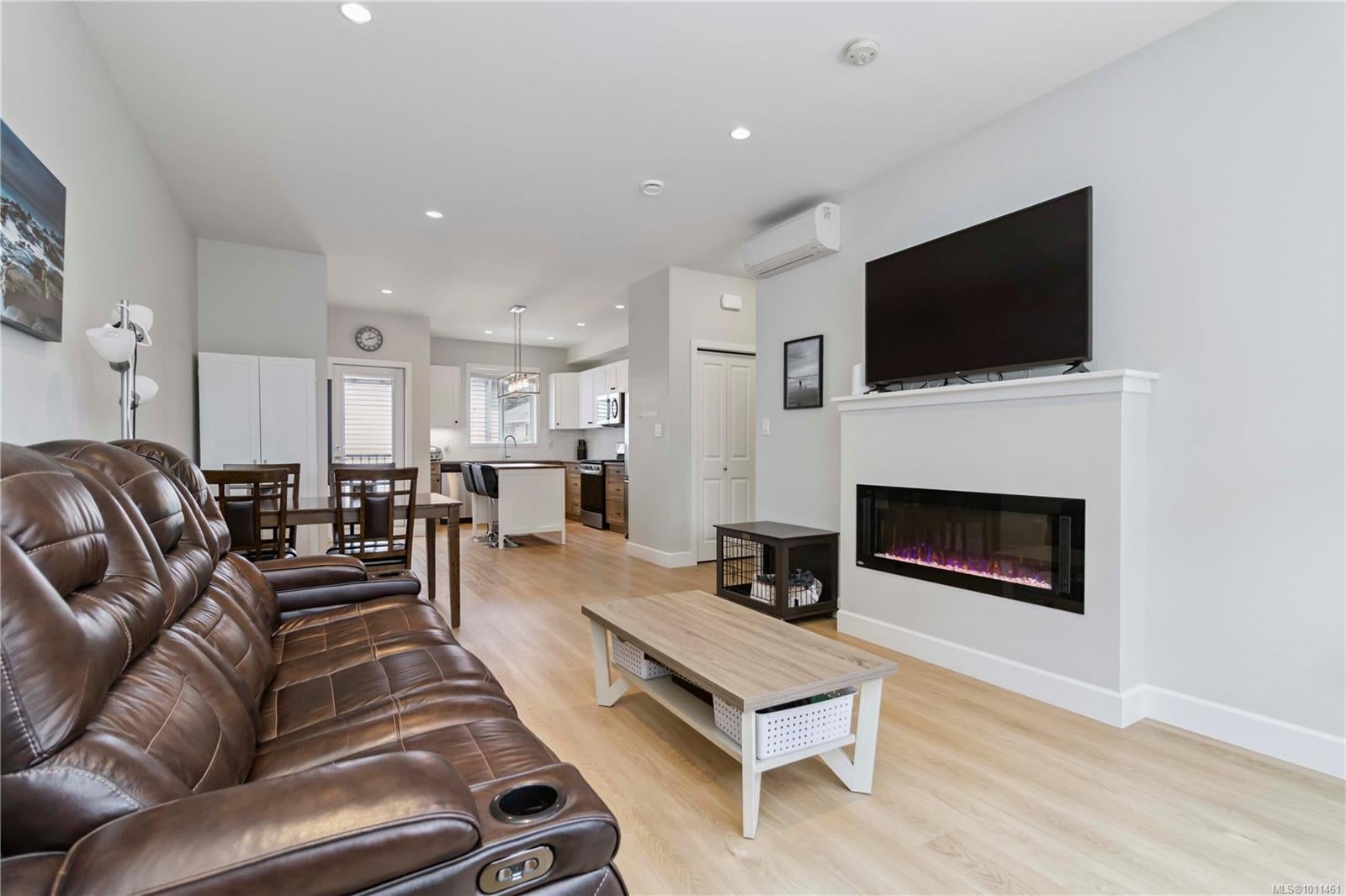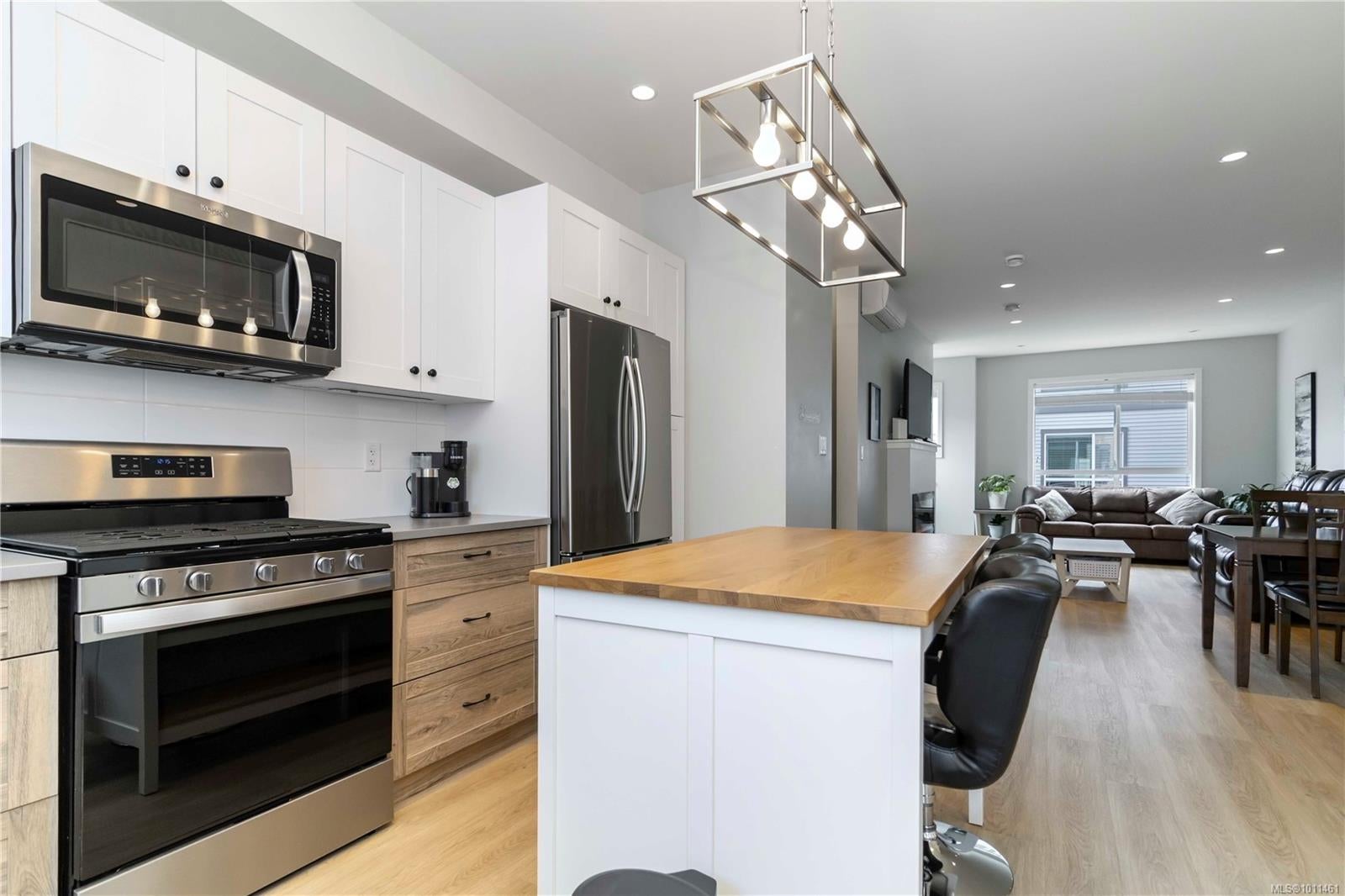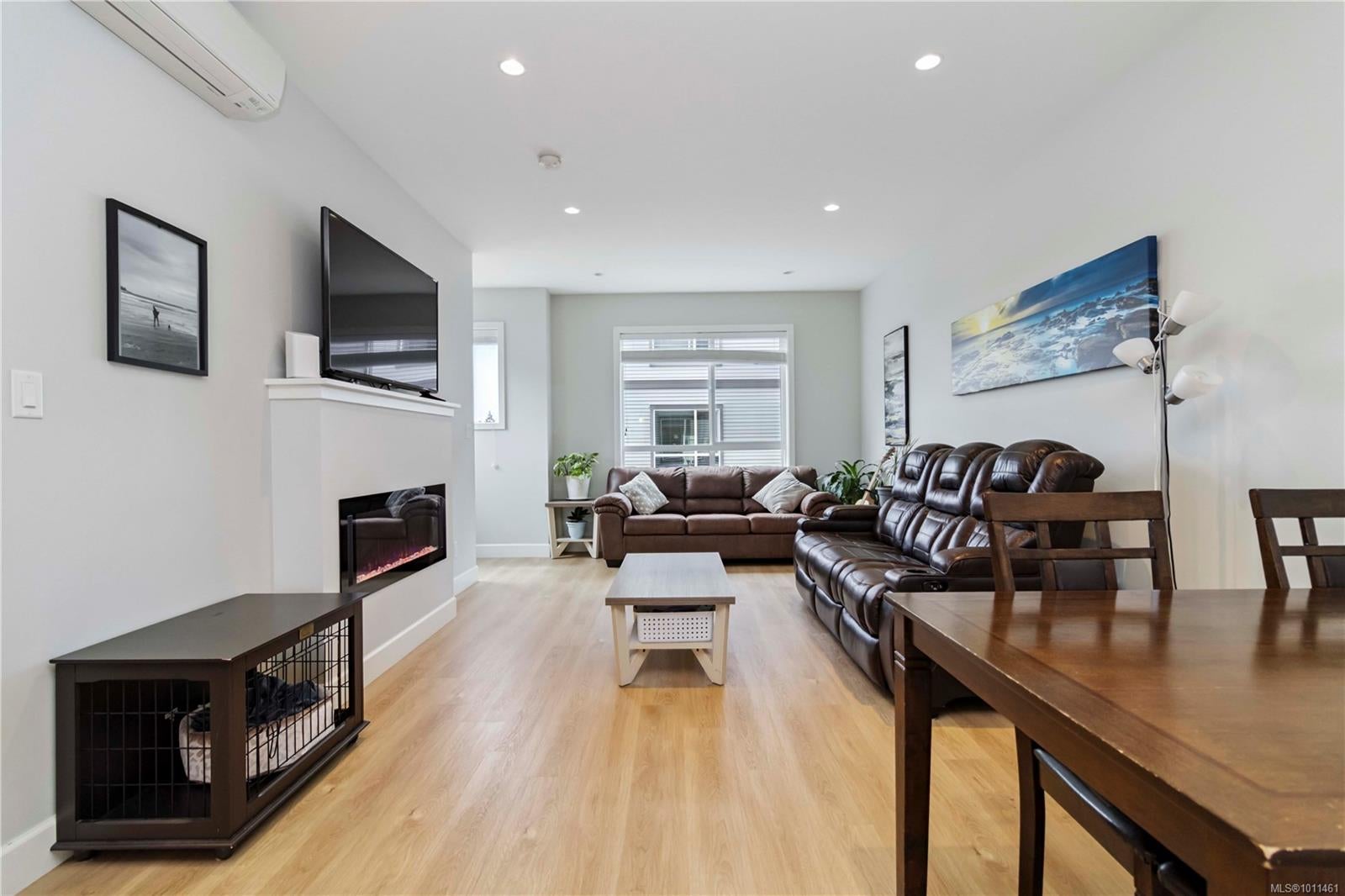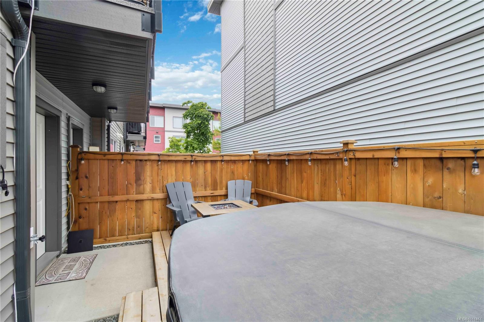 Corner unit, best location in the whole complex! Experience this beautifully designed townhome in the desirable Luxton Flats community. Offering 1,317 sq ft of thoughtfully laid-out space, this 3-bedroom, 3-bath home features an open-concept main floor with soaring 9-foot ceilings that enhance the sense of space and light. The contemporary kitchen is equipped with quartz countertops, a stylish tiled backsplash, gas range, and stainless steel appliances—perfect for both cooking enthusiasts and entertainers. Unwind by the sleek linear electric fireplace or step onto the private deck, complete with a natural gas BBQ hookup for easy outdoor dining. Upstairs, the spacious primary bedroom includes a modern ensuite with a walk-in shower. Additional highlights include a tandem garage, fully fenced yard with a hot tub, energy-efficient 2 heads ductless heat pump with A/C, and gas hot water system.