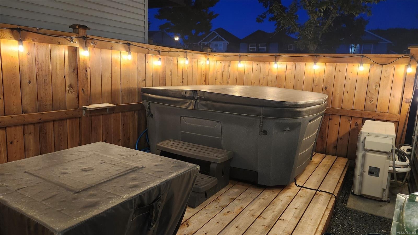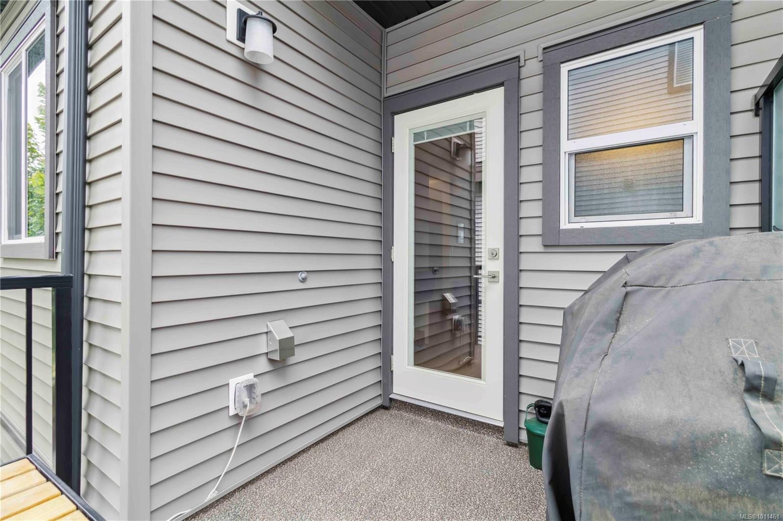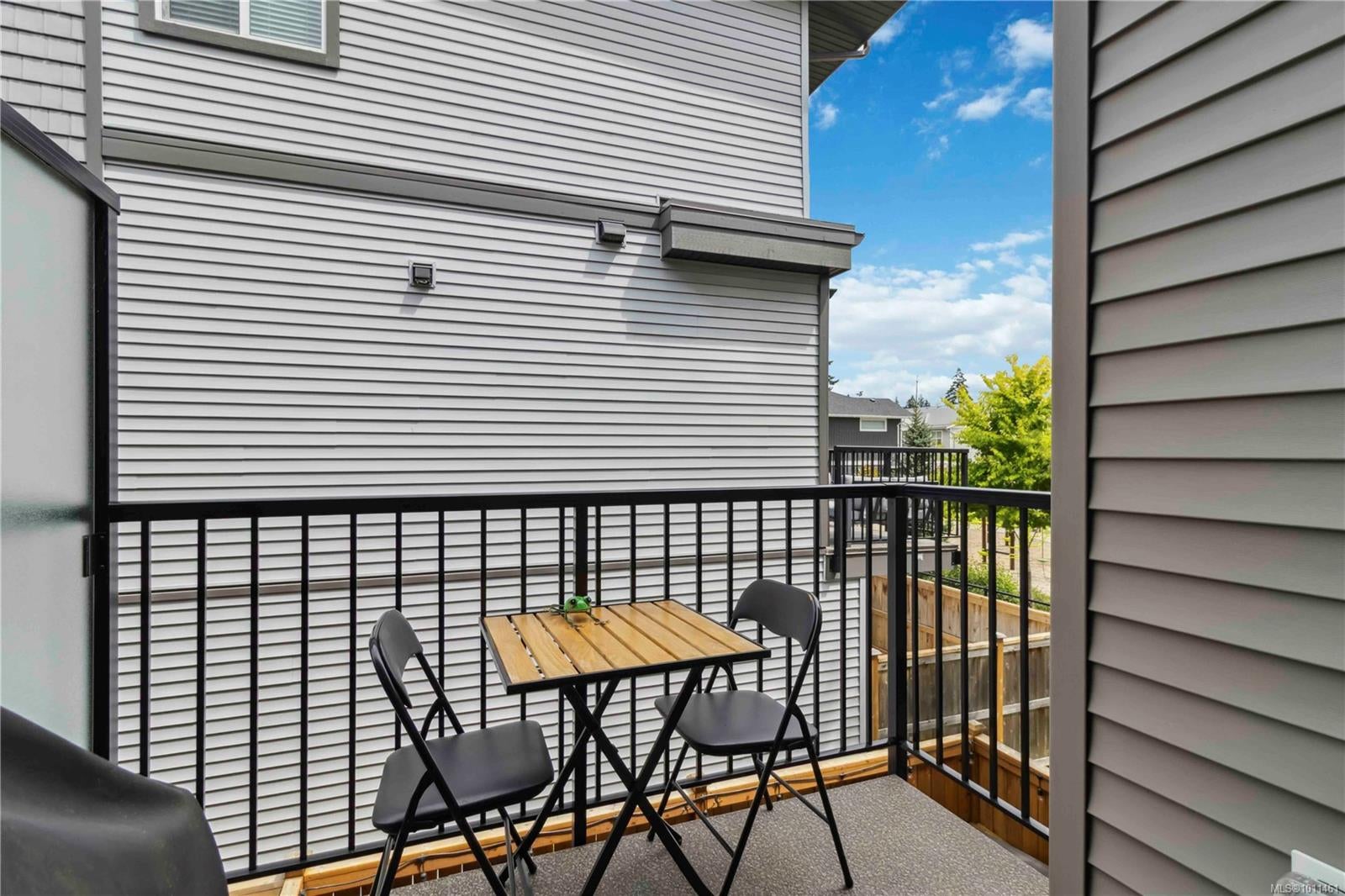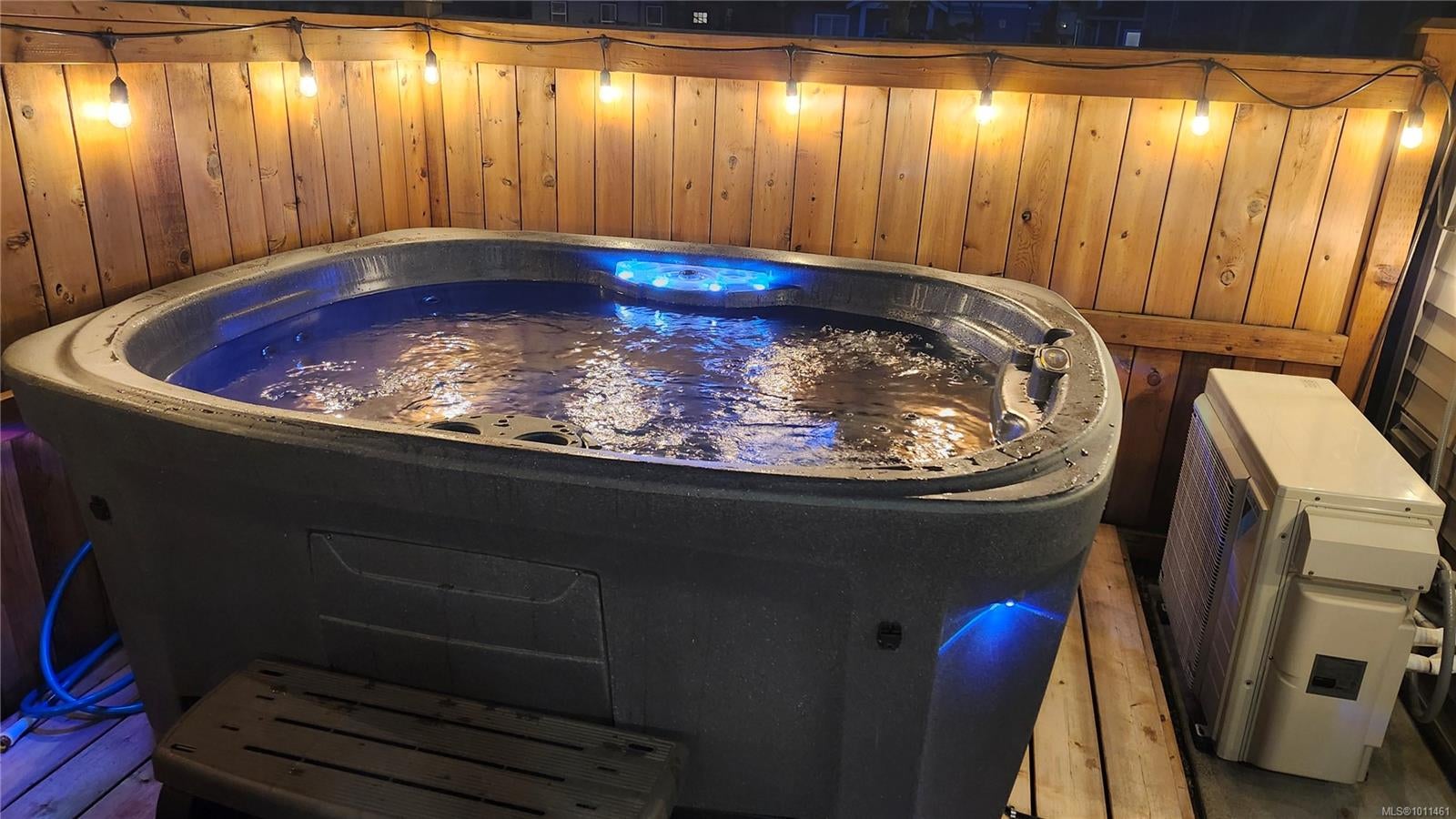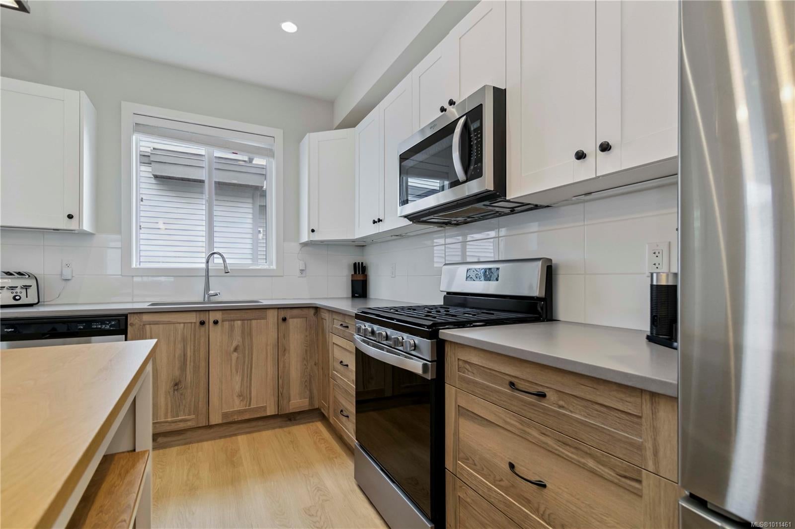 Corner unit, best location in the whole complex! Experience this beautifully designed townhome in the desirable Luxton Flats community. Offering 1,317 sq ft of thoughtfully laid-out space, this 3-bedroom, 3-bath home features an open-concept main floor with soaring 9-foot ceilings that enhance the sense of space and light. The contemporary kitchen is equipped with quartz countertops, a stylish tiled backsplash, gas range, and stainless steel appliances—perfect for both cooking enthusiasts and entertainers. Unwind by the sleek linear electric fireplace or step onto the private deck, complete with a natural gas BBQ hookup for easy outdoor dining. Upstairs, the spacious primary bedroom includes a modern ensuite with a walk-in shower. Additional highlights include a tandem garage, fully fenced yard with a hot tub, energy-efficient 2 heads ductless heat pump with A/C, and gas hot water system.